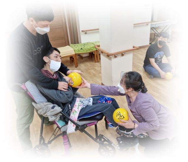 공을 이용한 스트레칭을 하고