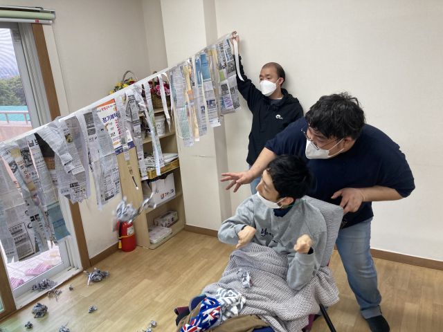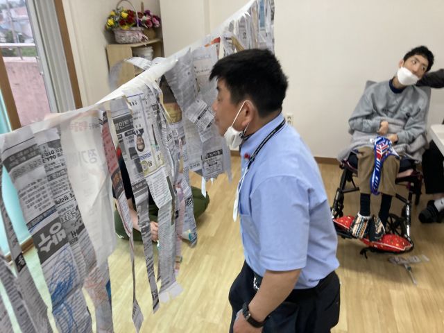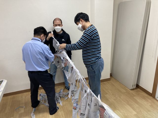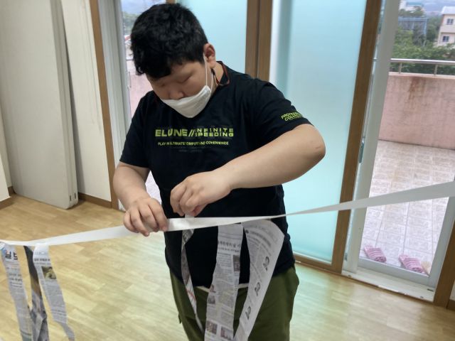 오감체험활동으로 신문지를 찢고 끈에 찢은 신문지를 붙여 커튼을 만들어 활동하였습니다.