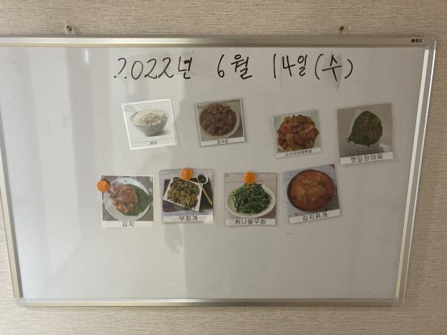 오늘의 점심메뉴는 김치찌개, 호박, 부추 부침개, 쏘야볶음, 취나물무침, 깻잎 장아찌, 김치 입니다.