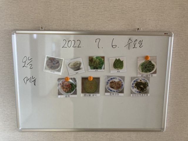 콩나물 냉국, 돈육구이, 취나물무침, 미역초무침, 상추, 깻잎, 김치 입니다.