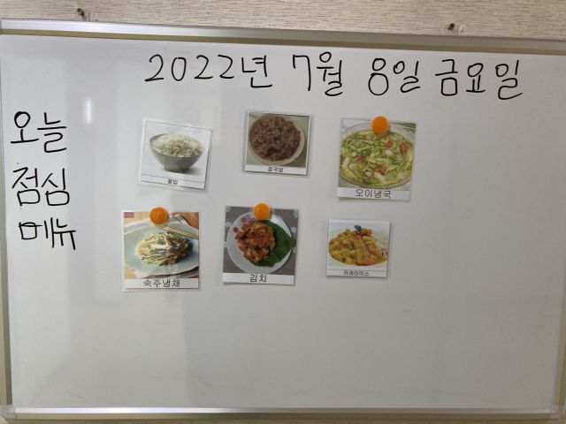 밥, 잡곡밥, 카레라이스, 오이냉국, 숙주냉채, 김치 입니다.