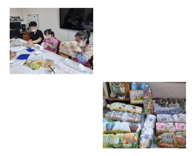 재활용아트활동으로 삼다수pt병과 냅킨, 물감등을 활용하여 화분만들기를 하였습니다.