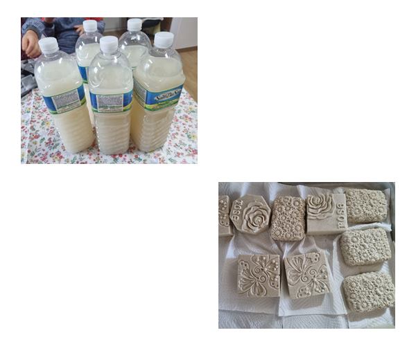 생태환경활동으로 em원액과 어성초, 천연재료, 쌀뜨물 등 이용하여 em비누와em발효액을 만들었습니다.