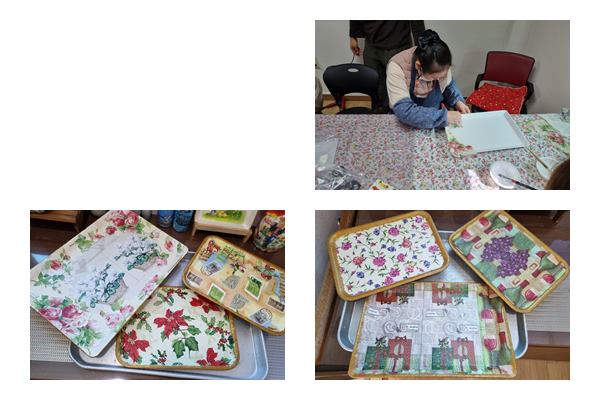 재활용아트활동으로 가정에서 수거한 쟁반과 냅킨과 물감 등을 이용하여 리폼하였습니다.