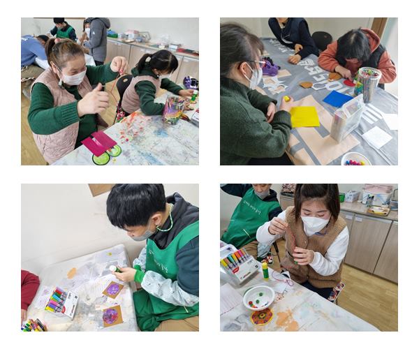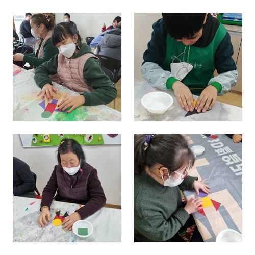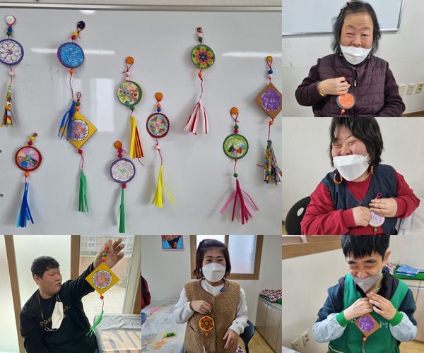 창의미술활동으로 노리개 모양을 재단하고 남은 색지로 세모, 네모, 동그라미로 오려 사람, 꽃, 집 등을 다양하게 표현하였고 한국의 전통 노리개도 만들었습니다.
