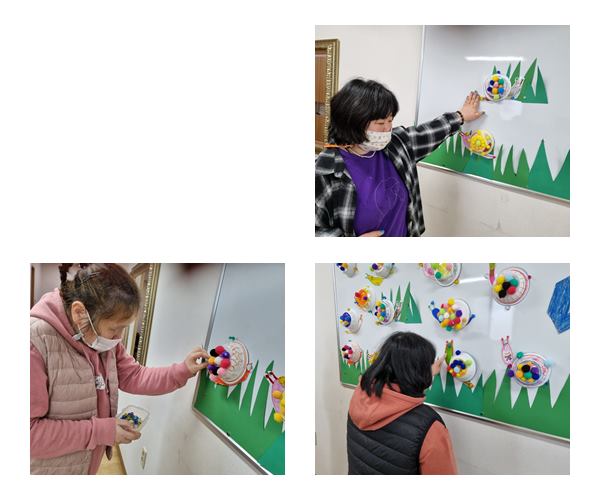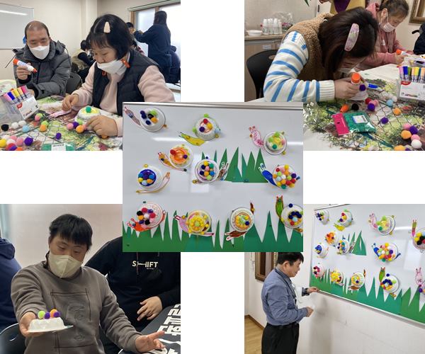 창의미술활동으로 햇반용기와 뽕뽕이를 활용하여 달팽이집을 꾸몄습니다.
