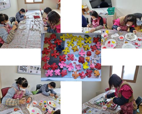 재능키움활동으로 계란판을 탐색하고 어떤 것을 만들지에 대해 서로 이야기를 나눈 후 꽃 모양으로 오리고 색칠하여 꽃 만들기를 하였습니다.