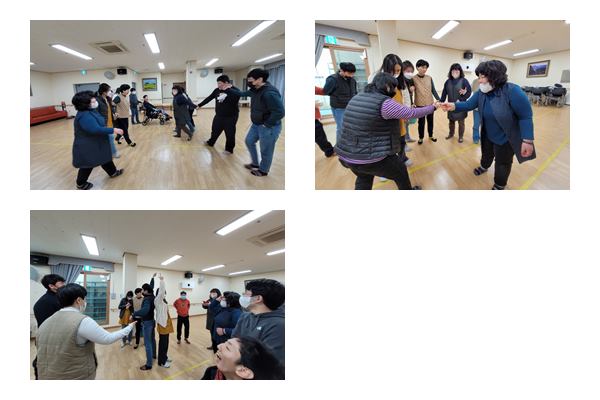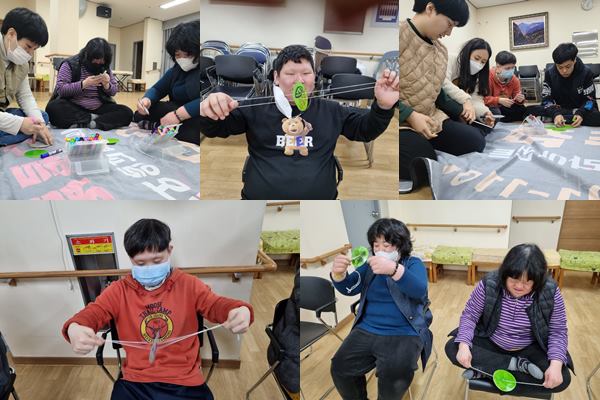 전통놀이활동으로 이용인과 함께 실 팽이를 직접 만들고 놀이 활동을 하였고, 우리 집에 왜 왔니 놀이 활동을 하였습니다.