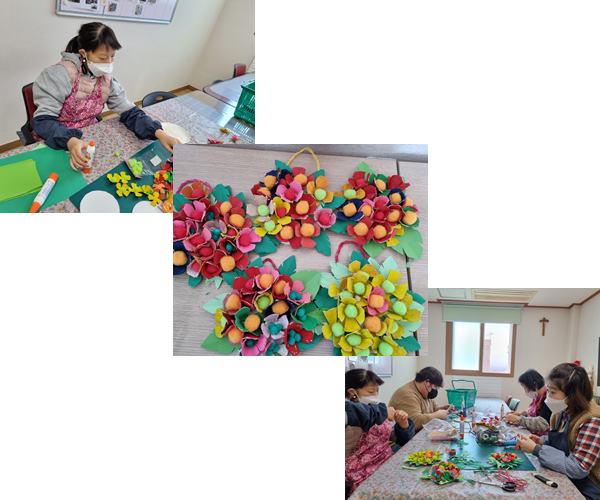 재능키움활동으로 지난 주에 계란판으로 만든 꽃을 활용하여 리스를 만들었습니다.