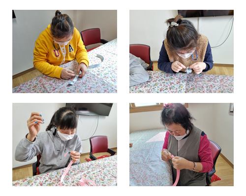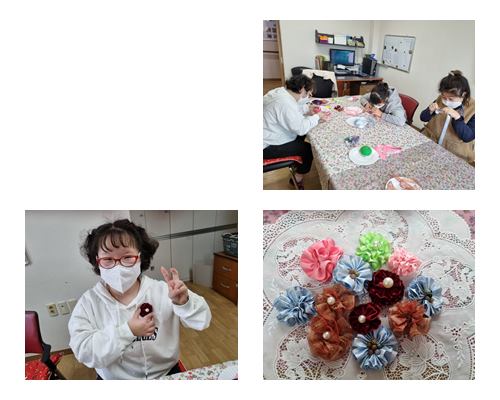 생활공예활동으로 케이크 리본과 구슬 등을 활용하여 브로치를 만들었습니다.