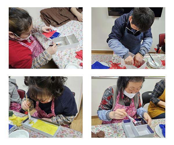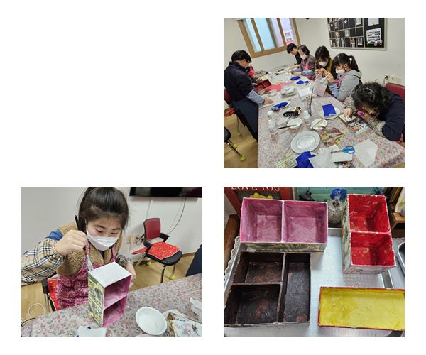 생활공예활동으로 폐 상자와 한지, 냅킨을 활용하여 정리함을 만들었습니다.