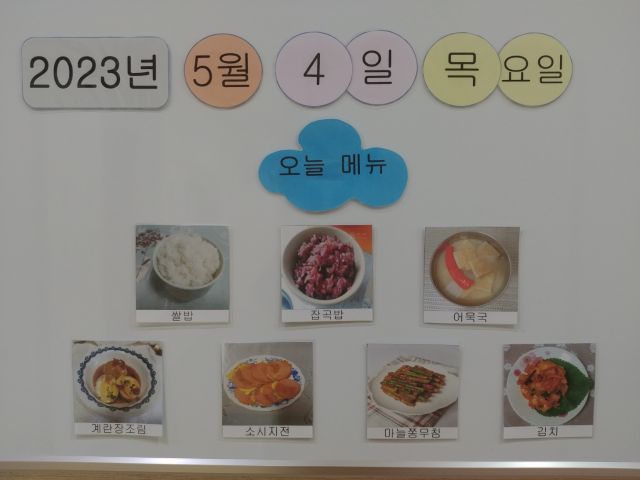 쌀밥, 잡곡밥, 어묵국, 쏘시지전, 계란버섯장조림, 마늘쫑무침, 김치