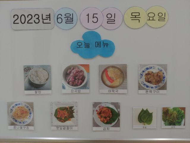 밥, 잡곡밥, 어묵국, 돈구이, 겉절이, 콩나물무침, 김치, 상추, 깻잎