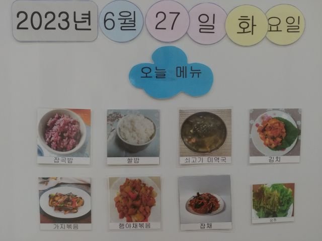 잡곡밥, 쌀밥, 쇠고기미역국, 돈야채볶음, 가지볶음, 잡채, 김치, 상추