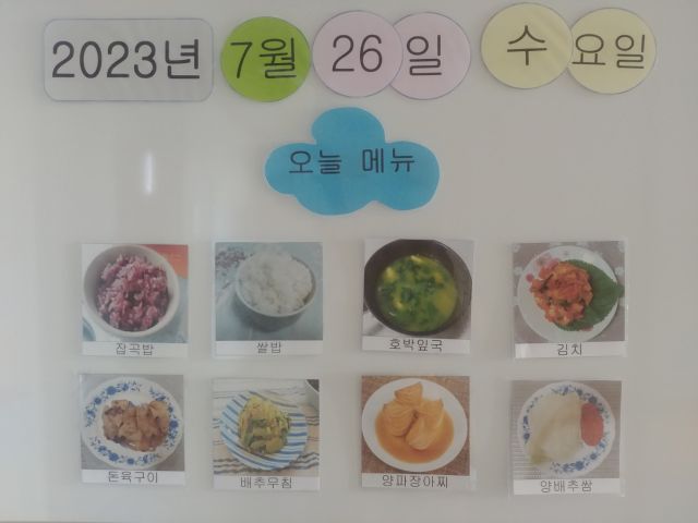 쌀밥, 잡곡밥, 호박잎국, 돈구이, 양배추쌈, 참외무침, 배추무침, 장아찌, 김치