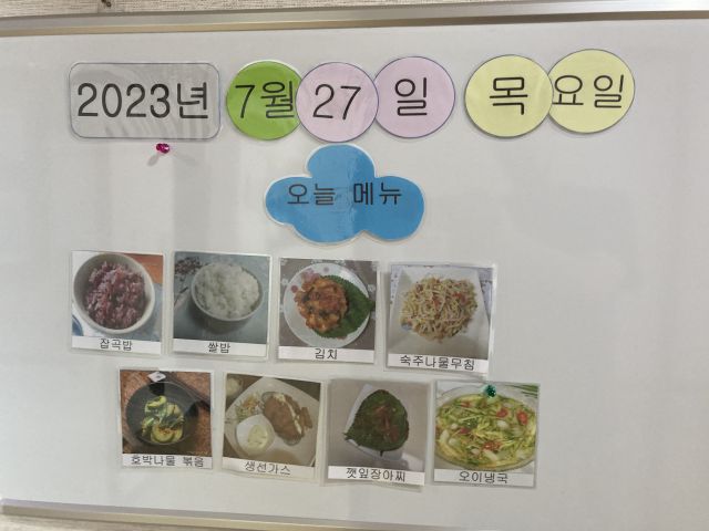 오이 냉국, 생선가스, 숙주나물 샐러드, 호박나물 볶음, 깻잎 장아찌, 김치, 밥 입니다.