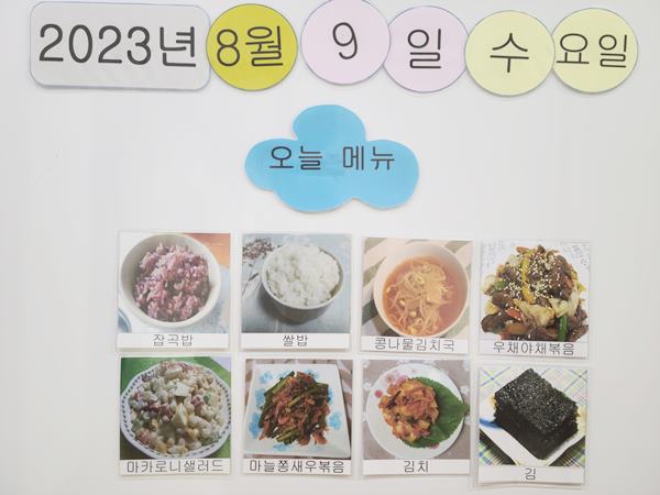 김치, 김치콩나물국, 우채야채볶음, 마카로니샐러드, 마늘쫑볶음, 김