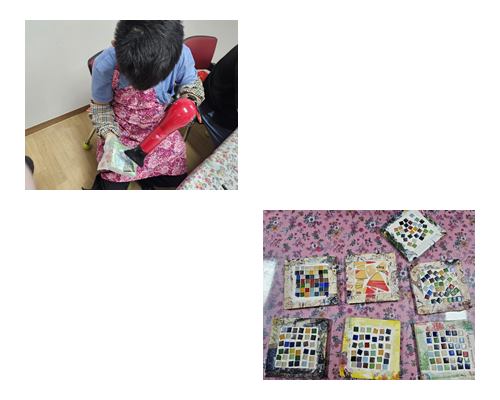 생활공예활동으로 모자이크 타일과 cd를 활용하여 컵 받침대를 만들었습니다.