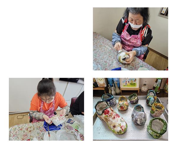 생활공예활동으로 폐운동화, 구멍이 난 양말, 백시멘트, 냅킨 등을 활용하여 재활용 화분을 만들었습니다.