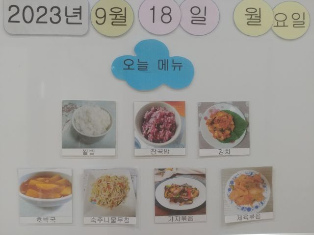 쌀밥, 잡곡밥, 호박국, 가지볶음, 숙주나물무침, 돈야채볶음, 김치