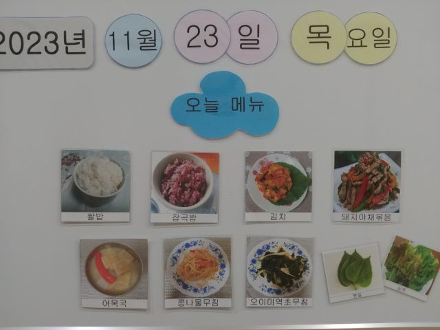 쌀밥, 잡곡밥, 어묵국, 돈야채볶음, 콩나물무침, 오이미역초무침, 김치, 상추, 깻잎