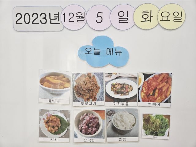 호박된장국, 두루치기, 가지볶음, 떡볶이, 김치, 상추