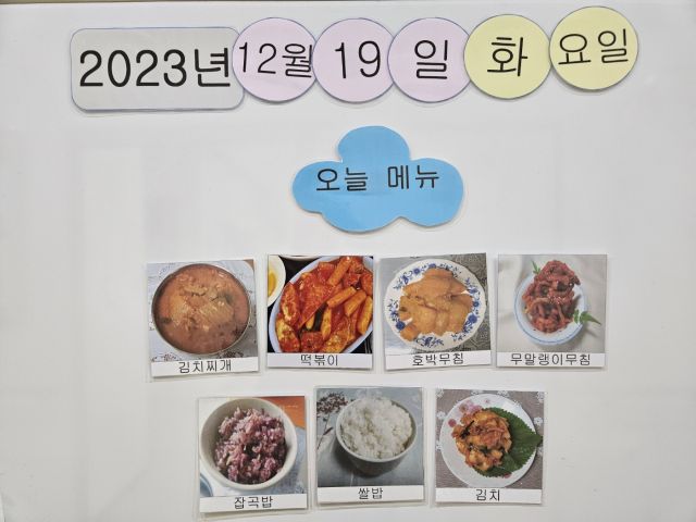 김치찌개, 떡볶이, 호박나물, 무말랭이무침, 김치