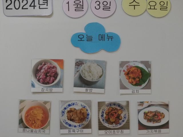 쌀밥, 잡곡밥, 콩나물김칫국, 돈구이, 가지볶음, 오이초무침, 김치