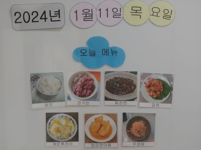 쌀밥, 잡곡밥, 짜장면, 계란후라이, 김치, 무생채, 장아찌
