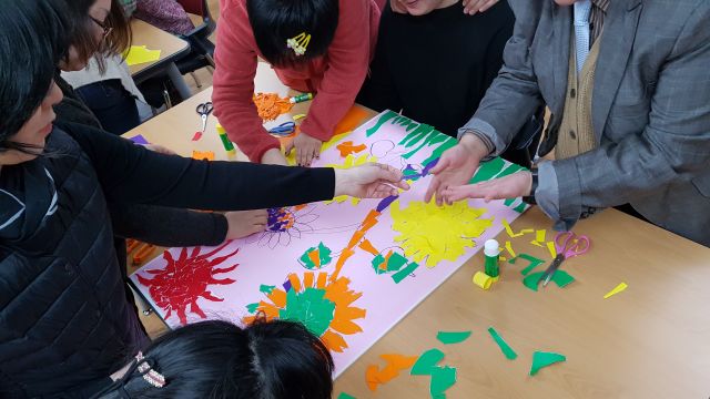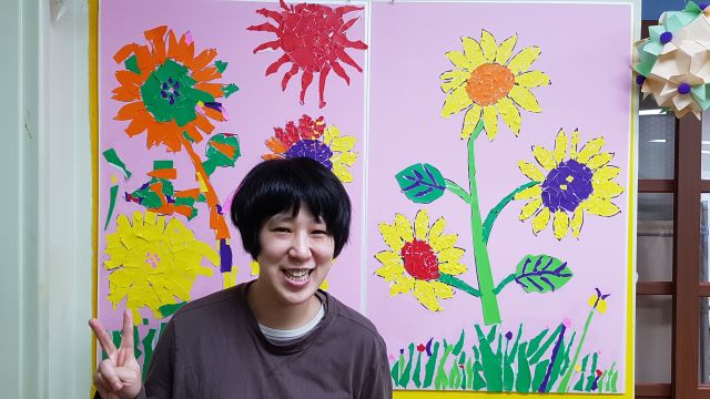 색종이를 잘라 해바라기 꽃 콜라주를 만들었어요.