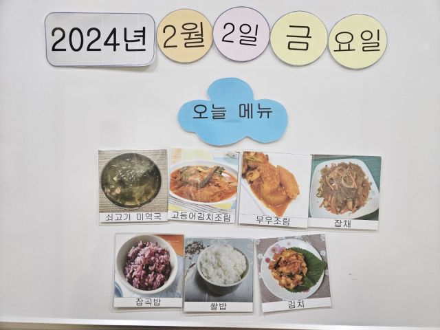 쇠고기미역국, 고등어조림, 무조림, 잡채, 김치찜