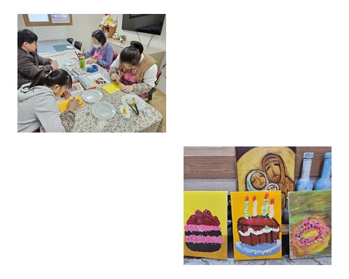 재능키움활동으로 모델링페이스와 아크릴 물감을 활용하여 각자가 먹고 싶은 케익 또는 도너츠를 표현하였습니다.