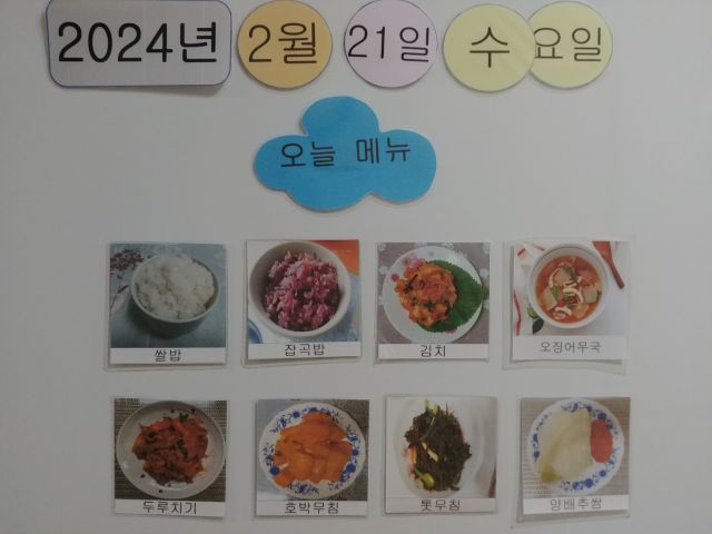 쌀밥, 잡곡밥, 오징어무국, 두루치기, 톳무침, 호박나물, 김치, 양배추쌈