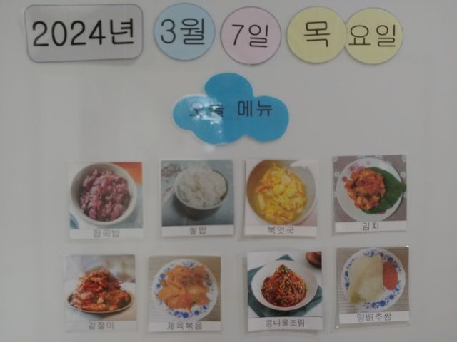 쌀밥, 잡곡밥, 북엇국, 김치, 돈야채볶음, 콩나물조림, 양배추쌈, 겉절이