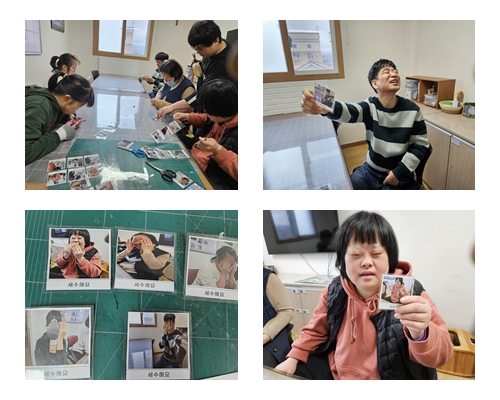 보완대체의사소통으로 지난 주 개인별로 양치하는 모습을 찍어 상징카드를 만들고 세수해요 몸짓언어와 상징카드를 만들어 의사소통 활동을 하였습니다.