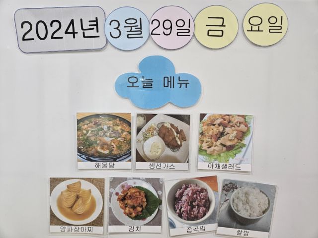 매운해물탕, 생선가스, 야채샐러드, 양배추장아찌, 김치