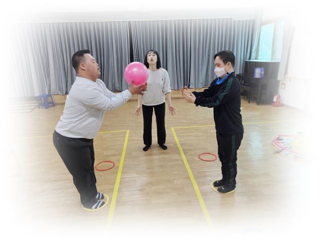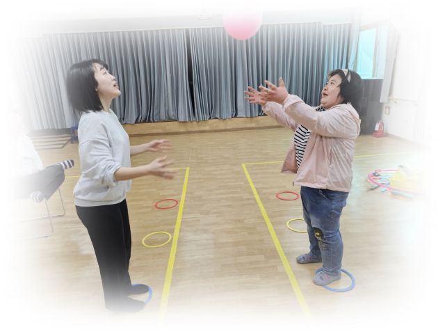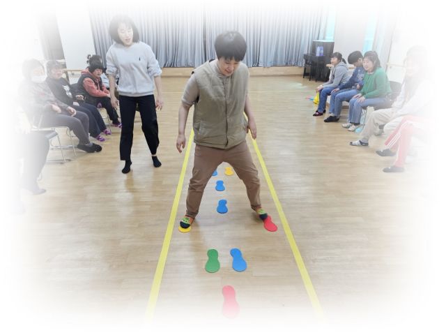 심리운동으로 링, 막대, 발모양 판을 이용하여 손발맞춰 이동하는 활동을 하였습니다.