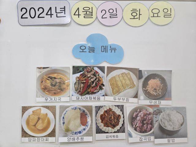 우거지국, 돈야채볶음, 두부전, 무생채, 장아찌, 양배추쌈, 볶음김치