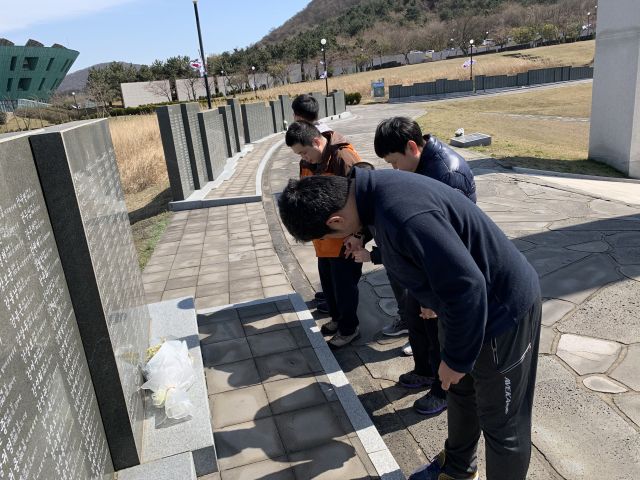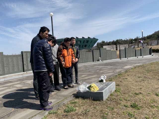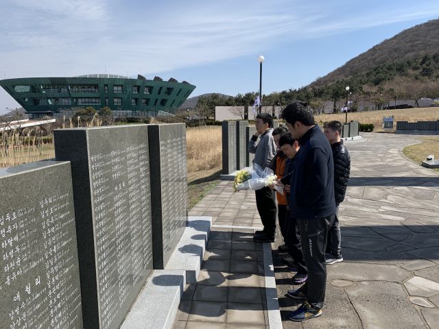 준비한 꽃을 위령탑에 헌화를 하고 마을별로 희생된 이름이 적힌 각인비를 둘러 보았습니다.