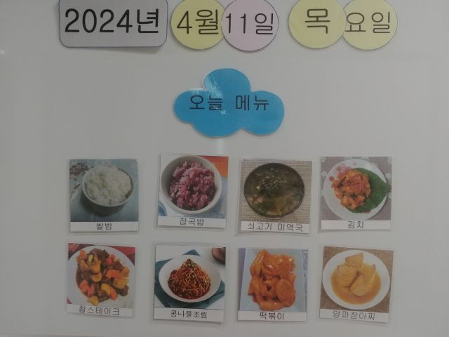 쌀밥, 잡곡밥, 쇠고기미역국, 찹스테이크, 떡볶이, 콩나물조림, 김치, 장아찌