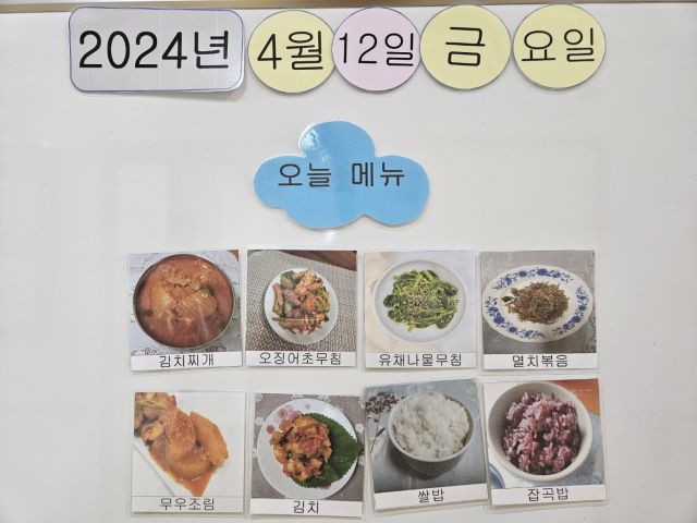 김치찌개, 오징어초무침, 유채나물무침, 멸치볶음, 무김치조림