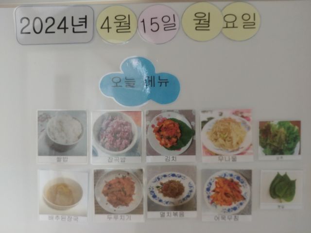 쌀밥, 잡곡밥, 배추된장국, 돈야채볶음, 어묵초무침, 무나물, 멸치볶음, 김치, 상추, 깻잎