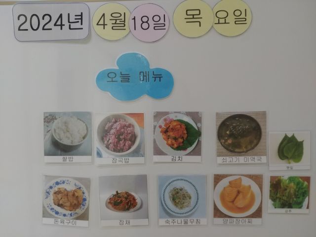 쌀밥, 잡곡밥, 쇠고기미역국, 돈구이, 숙주나물무침, 잡채, 장아찌, 김치, 상추, 깻잎