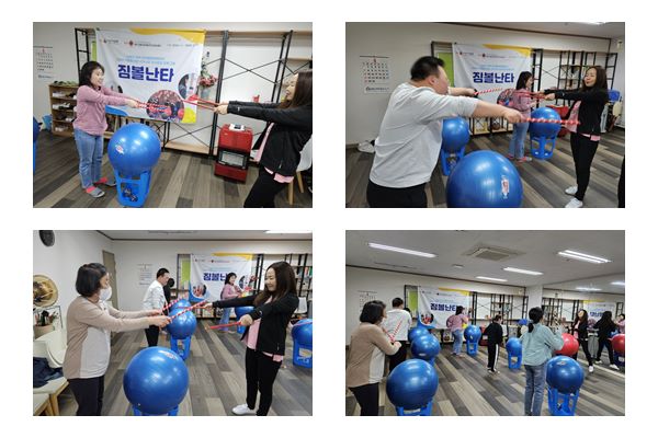 짐볼난타활동으로 어부바, 찔레꽃 음악에 맞에 장단과 율동을 배웠습니다.