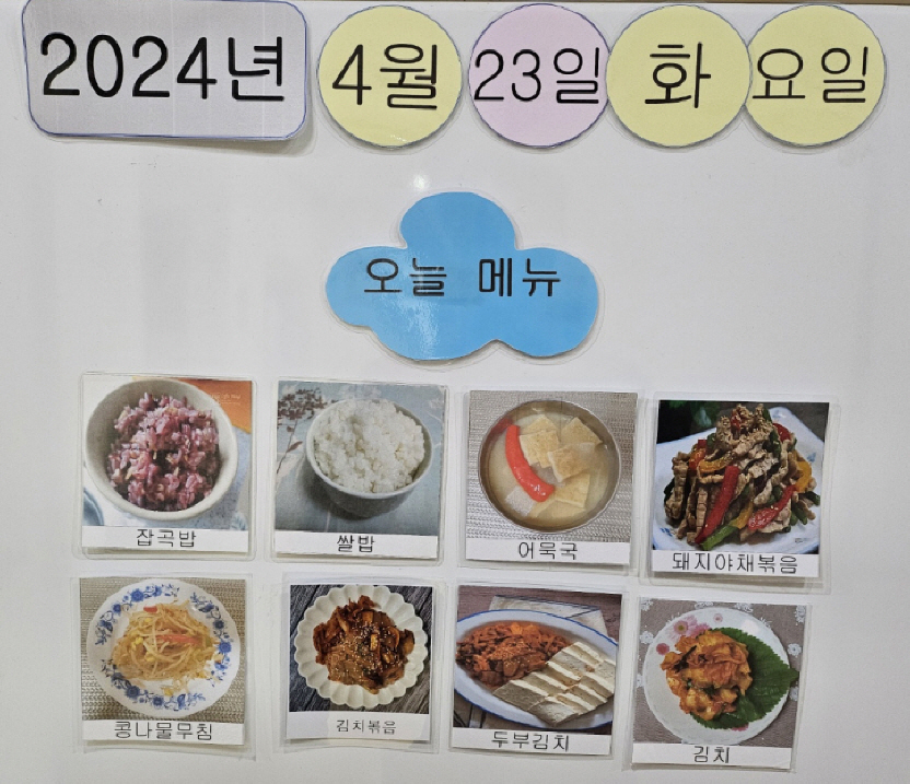 쌀밥, 잡곡밥, 어묵국, 돼지야채볶음, 콩나물무침, 김치볶음, 두부김치, 김치