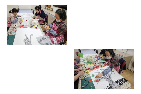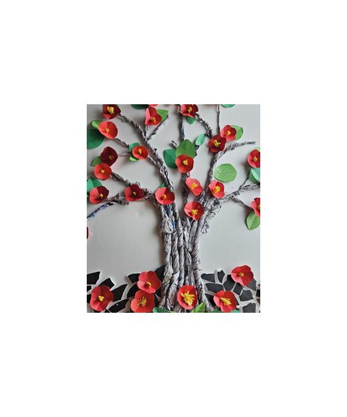 재능키움활동으로 신문지와 자투리 우드락, 색지 등을 활용하여 동백 나무를 만들었습니다.