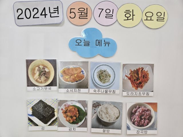 소고기무국, 소시지전, 숙주나물무침, 도라지초무침, 김, 김치