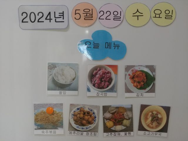 쌀밥, 잡곡밥, 숙주볶음, 메추리알 장조림, 고추잡채, 꽃빵, 쇠고기무국, 김치