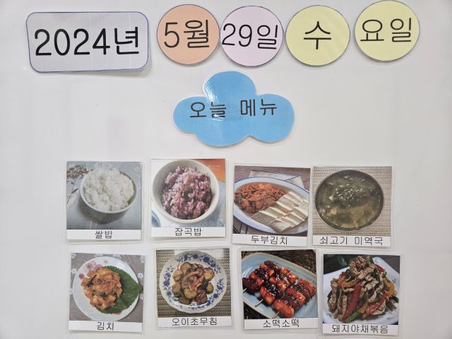 쇠고기미역국, 소떡소떡, 두부김치, 돼지고기볶음, 오이초무침