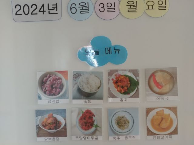 쌀밥, 잡곡밥, 어묵국, 닭볶음탕, 무우말랭이무침, 숙주나물무침, 김치, 장아찌